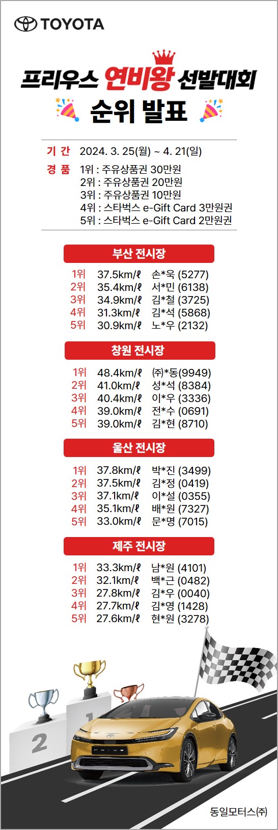 2024 토요타 프리우스 연비왕 선발대회에 참여해주신 모든 고객님께 감사드리며, 전시장별 상위 랭킹고객님께 경품을 드립니다.
