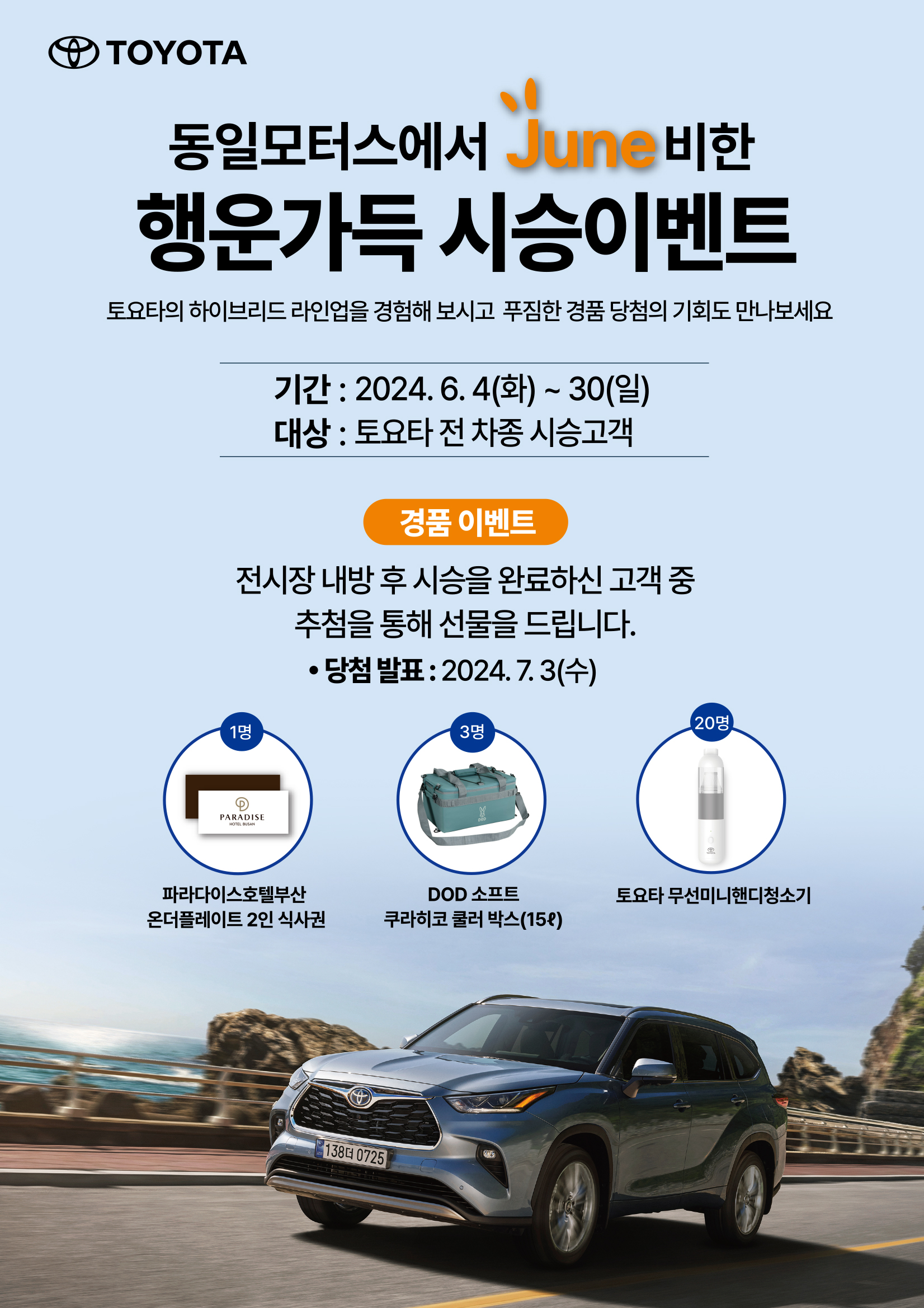 6월 한 달간, 토요타의 하이브리드 라인업을 경험해 보시고 경품 당첨의 기회도 만나보세요.