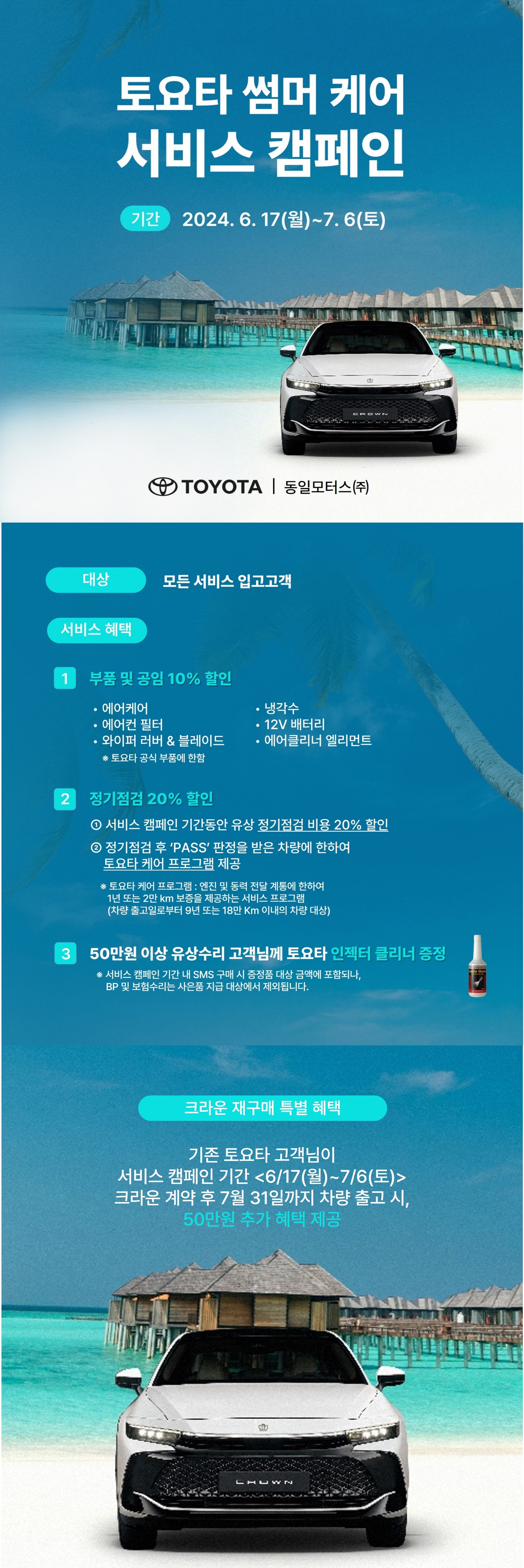 기존 토요타 고객님이 서비스 캠페인 기간 중 크라운을 계약하신 후, 7월 내에 출고하시면 50만원 추가 혜택을 드립니다.