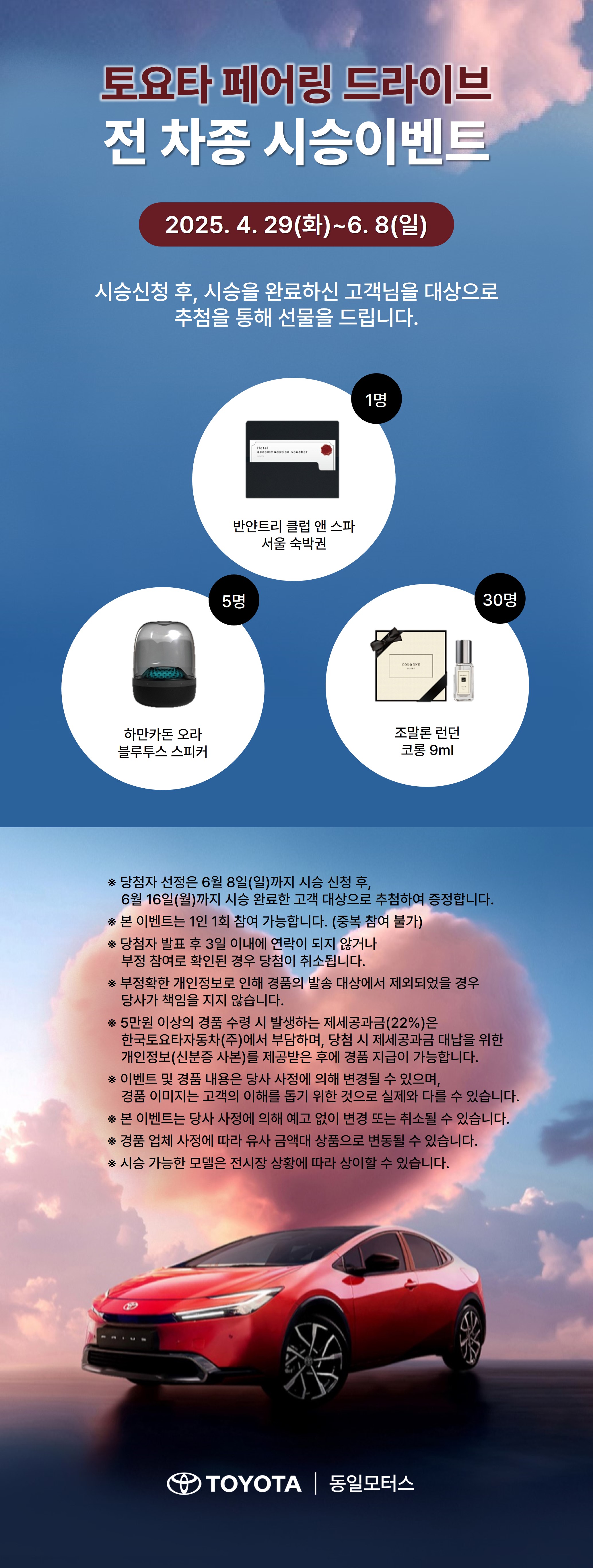 ※ 5만원 이상의 경품 수령 시 발생하는 제세공과금(22%)은 한국토요타자동차(주)에서 부담하며, 당첨 시 제세공과금 대납을 위한 개인정보(신분증 사본)를 제공받은 후에 경품 지급이 가능합니다.