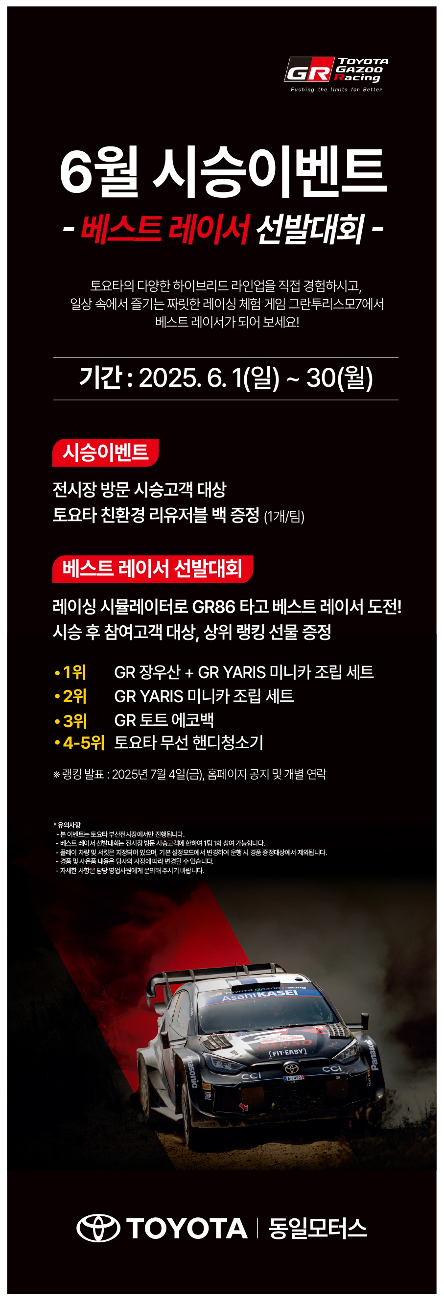 - 본 이벤트는 토요타 부산전시장에서만 진행되며, 전시장 방문 시승고객에 한하여 1팀 1회 참여 가능합니다.