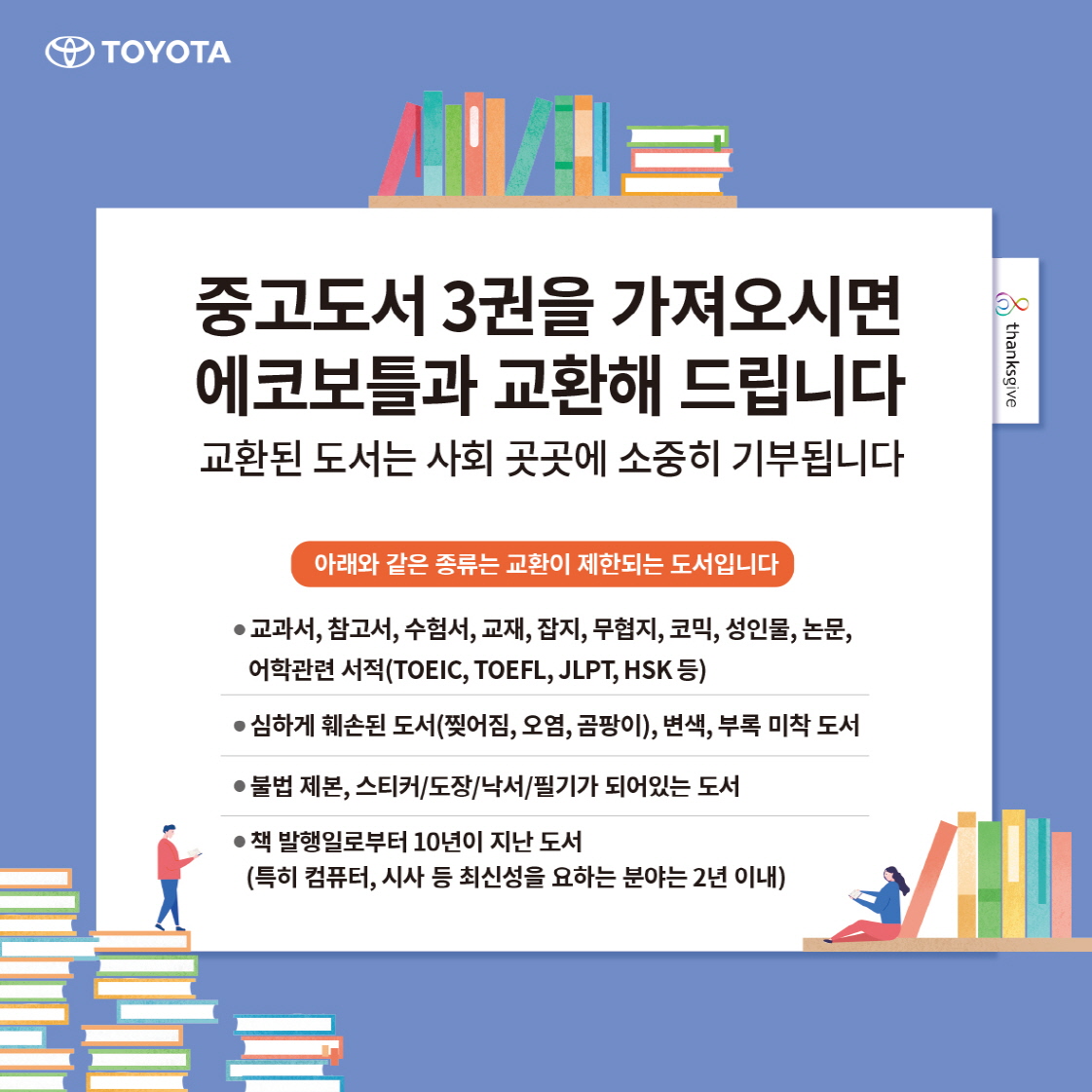 토요타 부산/해운대/창원/울산/제주 전시장 및 부산/사상/창원/울산/제주 서비스센터를 통해 도서기부를 하실 수 있으며,
