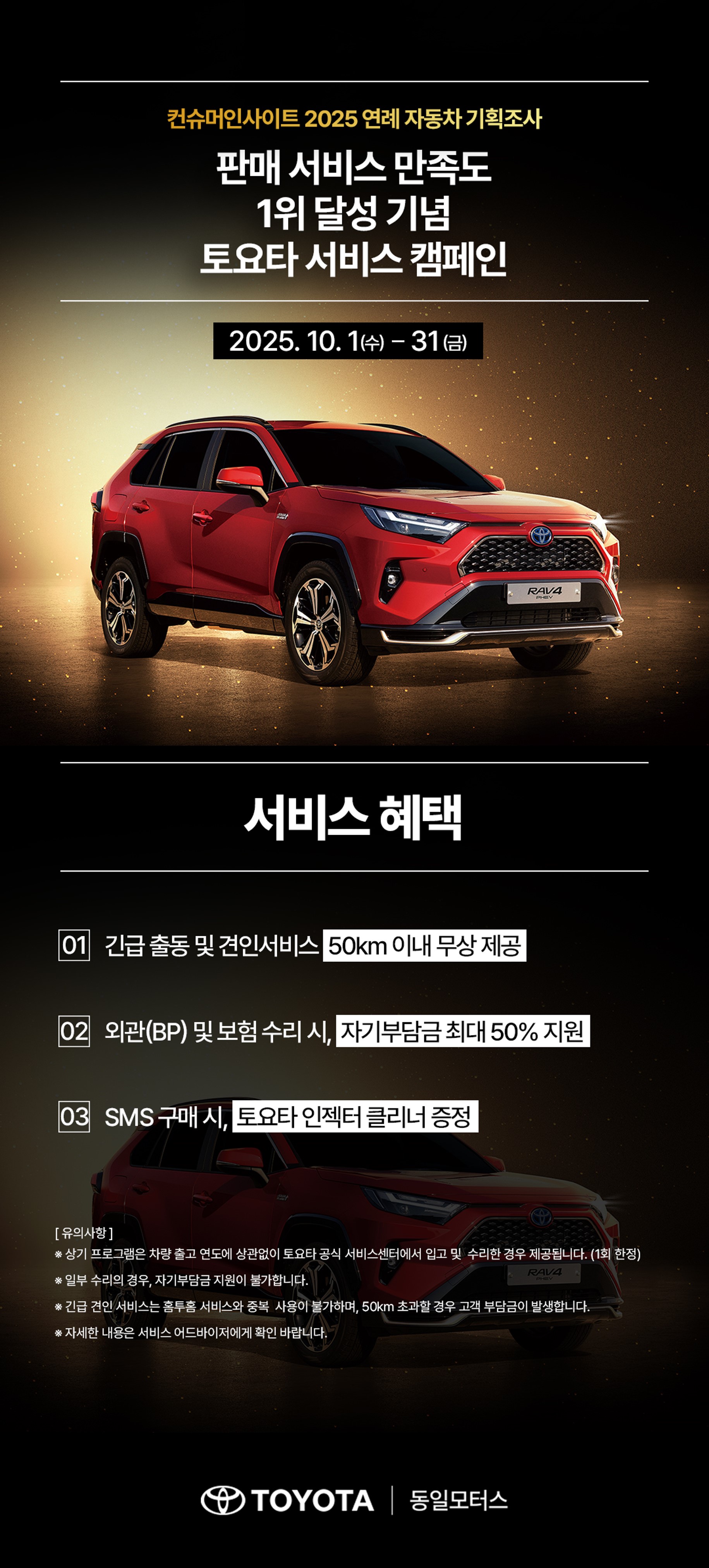 - 본 캠페인은 차량 출고 연도에 상관없이 토요타 공식 서비스센터에서 입고 및 수리한 경우 제공됩니다. (1회 한정)