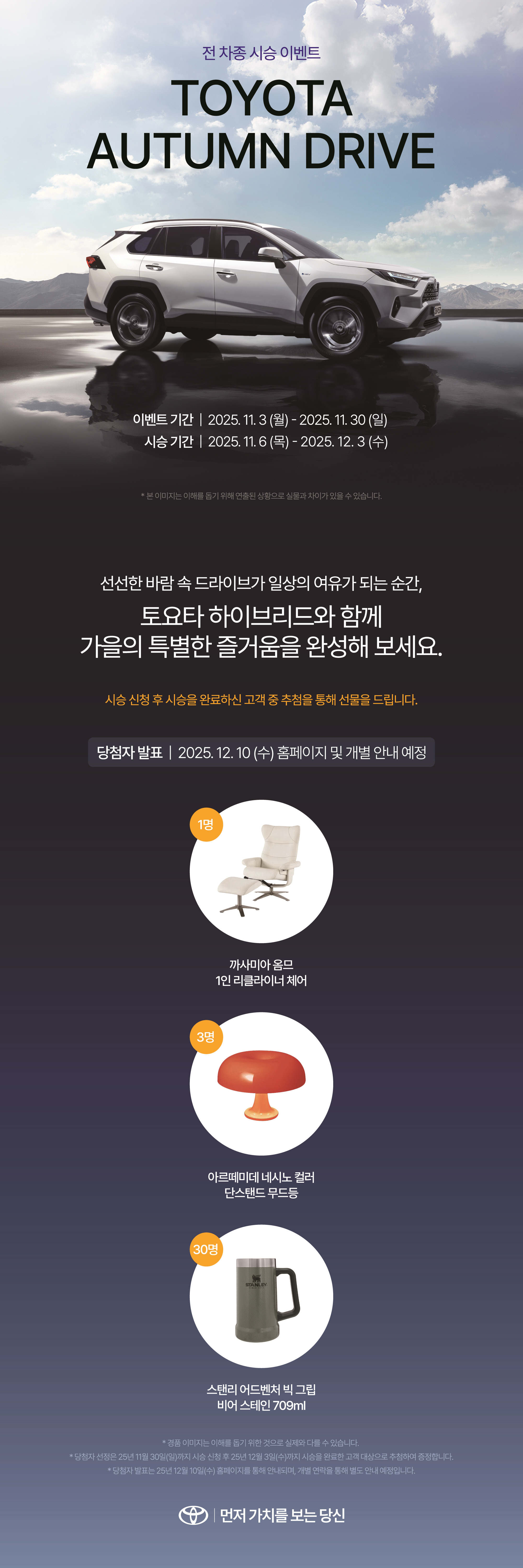 - 당첨자 선정은 11월 30일(일)까지 시승 신청 후, 12월 3일(수)까지 시승 완료한 고객 대상으로 추첨하여 증정합니다.