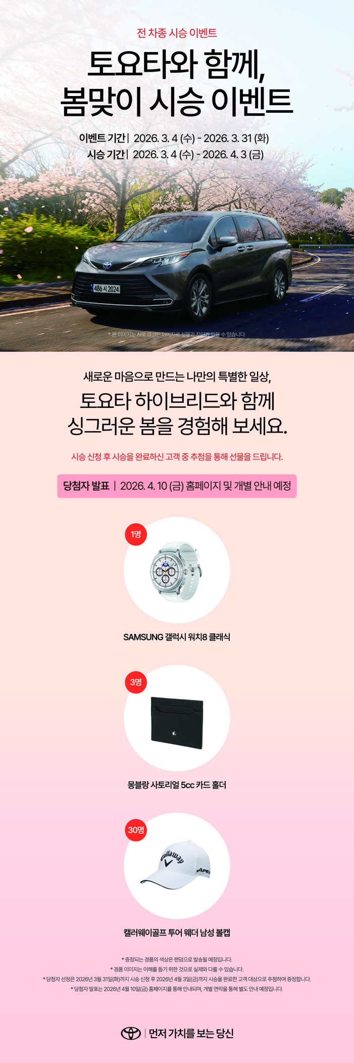- 당첨자 선정은 2026년 3월 31일(화)까지 시승 신청 후, 4월 3일(금)까지 시승 완료한 고객 대상으로 추첨하여 증정합니다.