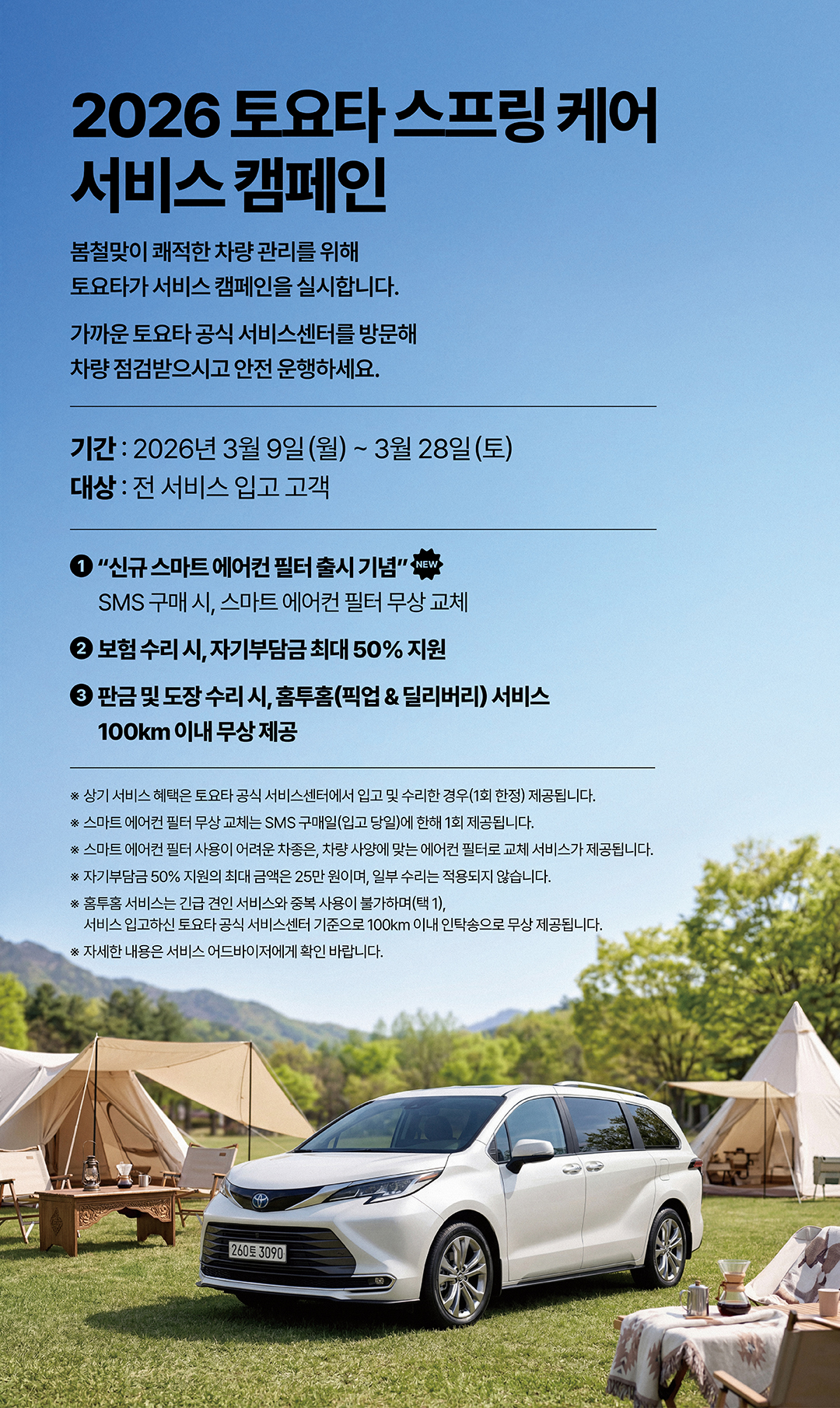 - 서비스 혜택은 토요타 공식 서비스센터에서 입고 및 수리한 경우 1회 한정 제공됩니다.