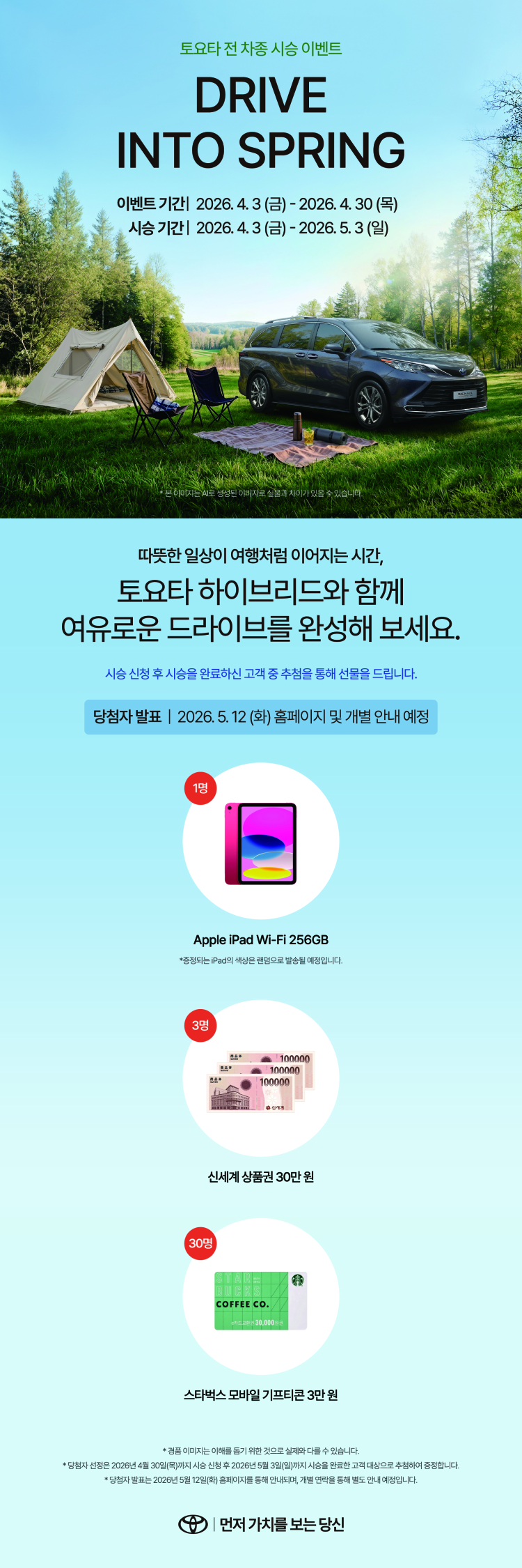- 당첨자 선정은 2026년 4월 30일(목)까지 시승 신청 후, 5월 3일(일)까지 시승 완료한 고객 대상으로 추첨하여 증정합니다.