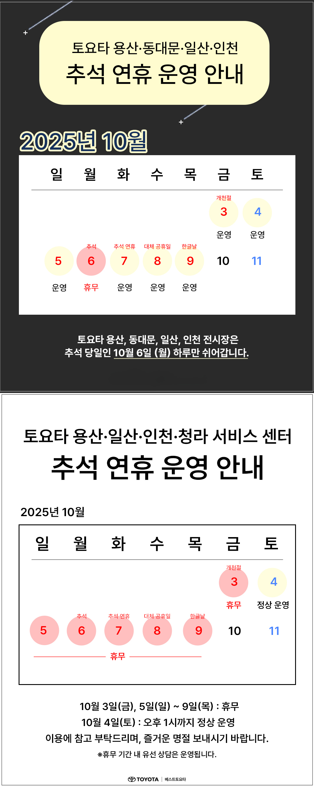 전시장 및 서비스 센터 추석 연휴 운영 안내